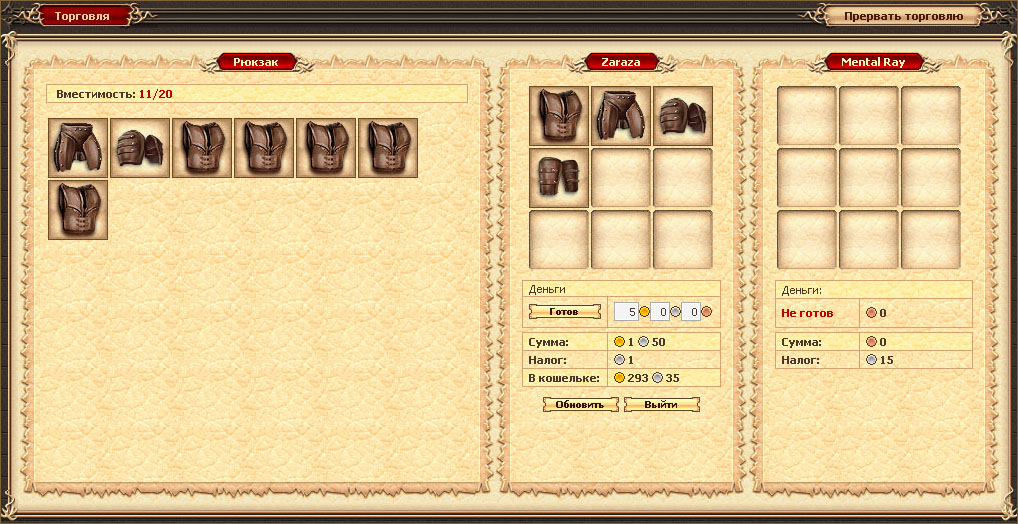 Если же торговлю предложили вам, подобное сообщение в чате увидите вы. Если выбранный игрок согласится начать с вами торговые дела (или вы примете предложение торговли от другого игрока), вы попадете в интерфейс торговли: Нажав на кнопку Также вместе с вещами вы можете сразу передать деньги.