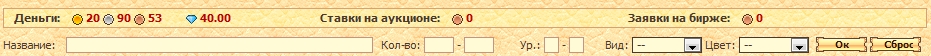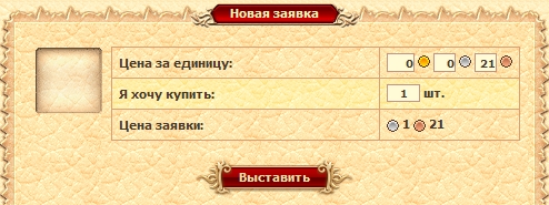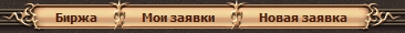 При продаже товаров на Бирже деньги вы получаете сразу же. При этом с каждой сделки взимается фиксированный налог в размере 1% от сделки. Примечание. Продавать по заявке можно только оружие и доспехи с максимально возможной прочностью. На оружии не должно быть никаких гравировок. II. Мои заявки В этой вкладке отображается список ваших заявок. Вы можете в любой момент отменить свою заявку. В этом случае вы получите (почтой) все предметы, которые успели продать игроки по указанной вами цене, а также остаток неизрасходованных средств. III. Новая заявка В этой вкладке можно создать новую заявку на Бирже. Для выбора предмета воспользуйтесь фильтром, выбрав параменты "тип" или "название". Затем укажите желаемую цену за единицу товара (по умолчанию предлагается стандартная госцена) и количество предметов, которое желаете приобрести (для ресурсов или эликсиров).