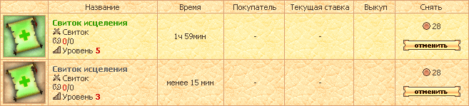 Кроме того, отсортировать лоты можно по: Напротив каждого предмета указаны стартовая цена (обязательно) и горячая цена (необязательно). Стартовая - начальная стоимость, за которую продавец готов отдать предмет и которую будут повышать игроки, желающие купить его. Горячая - стоимость, за которую игроки могут приобрести лот в любой момент, пока идет аукцион. Горячая цена всегда выше стартовой. В графе Время отражается примерное время окончания торгов. Это могут быть следующие интервалы: мало - менее 2-х часов; средне - от 2-х до 8-ми часов; много - более 8-ми часов.