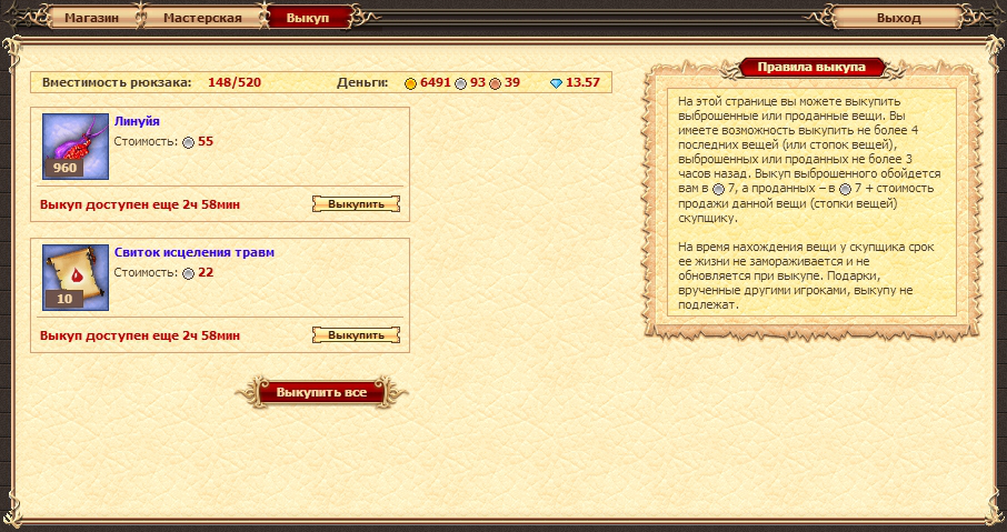 7, а проданного – в 7 + стоимость продажи данной вещи (стопки вещей) скупщику.Внимание! Срок жизни вещей, находящихся у скупщика, не замораживается и не обновляется при выкупе. Подарки, врученные другими игроками, выкупу не подлежат.