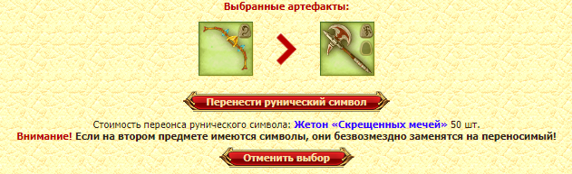 Будьте внимательны! Если на предмете, на который необходимо перенести рунический символ уже наложен другой символ - то новый символ будет наложен поверх имеющегося, тем самым безвозвратно его уничтожив!