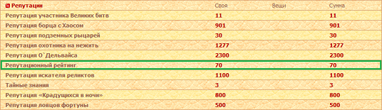 Репутационный рейтинг (РР) высчитывается исходя из общего «веса» всех медалей на персонаже.